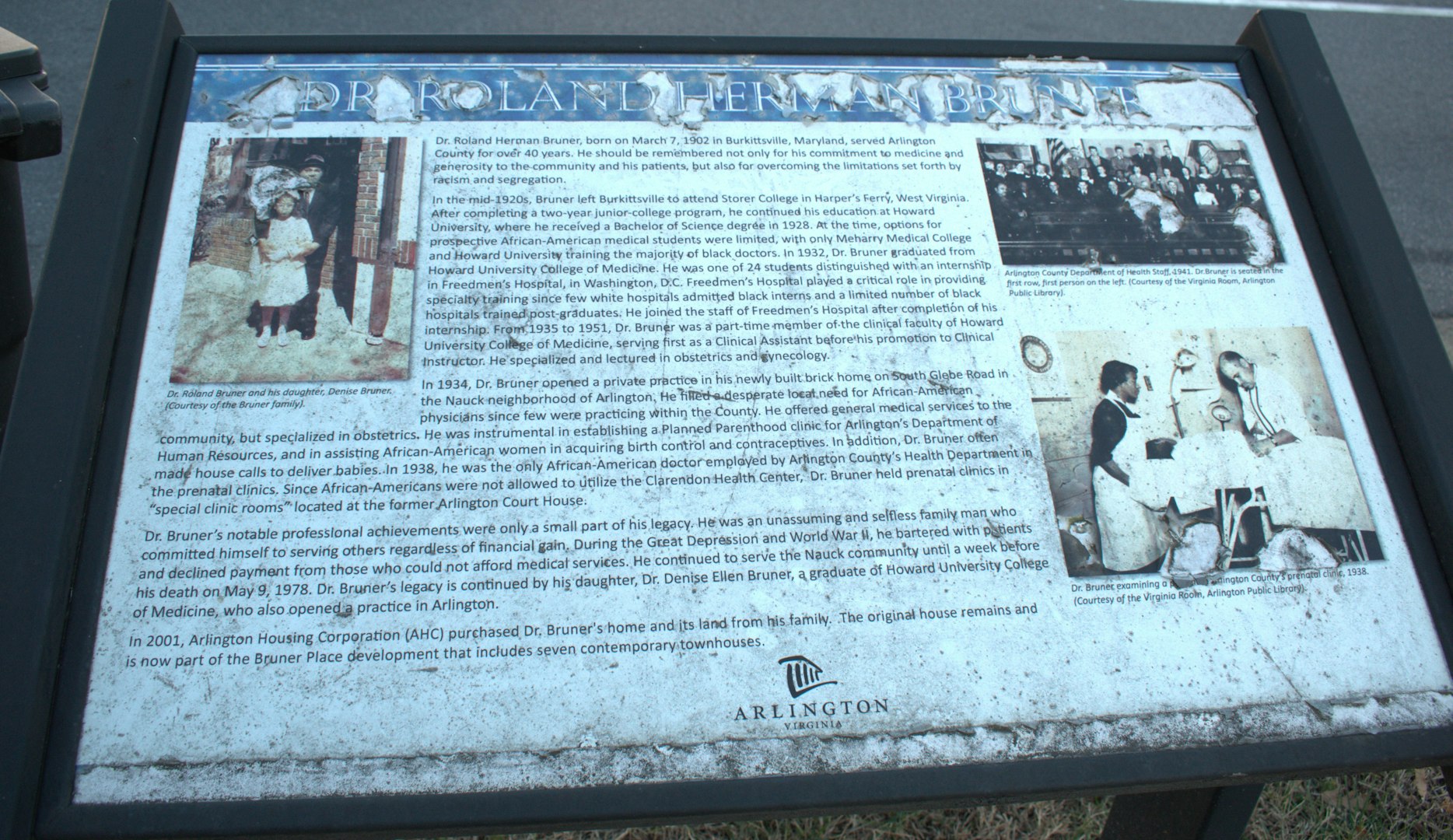 Dr. Roland Herman Bruner (1902-1978) was an obstetrician, lecturer, and the first African-American doctor to be hired by Arlington County’s Department of Health’s Prenatal Clinic in a time of bigotry, racism, and segregation.